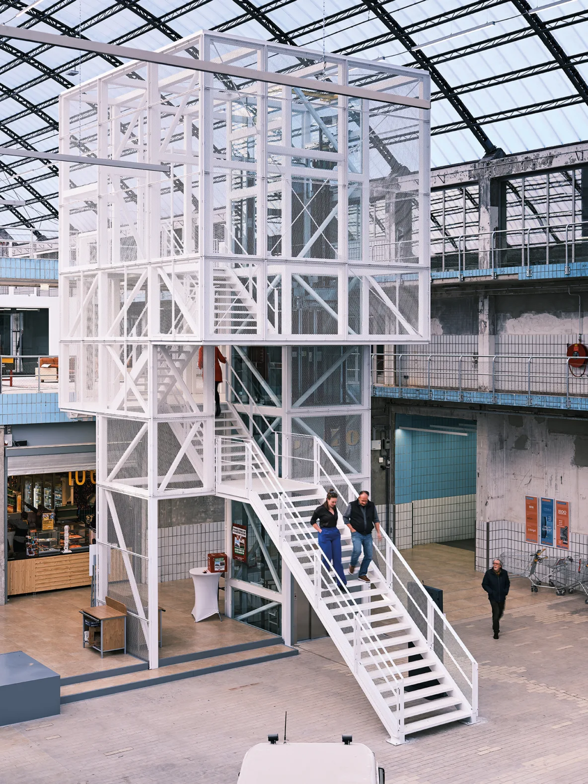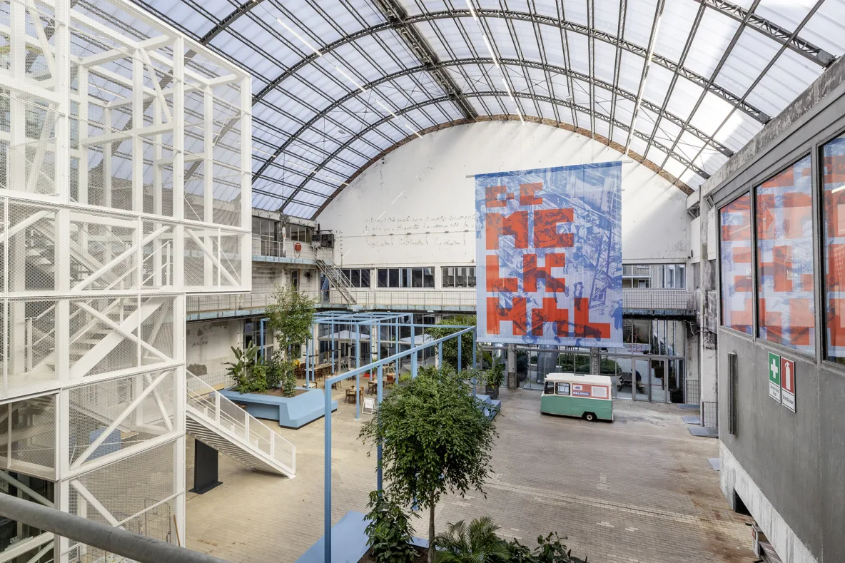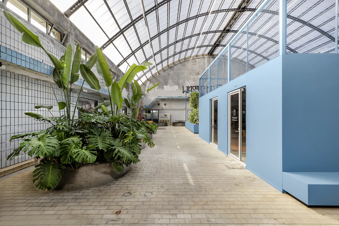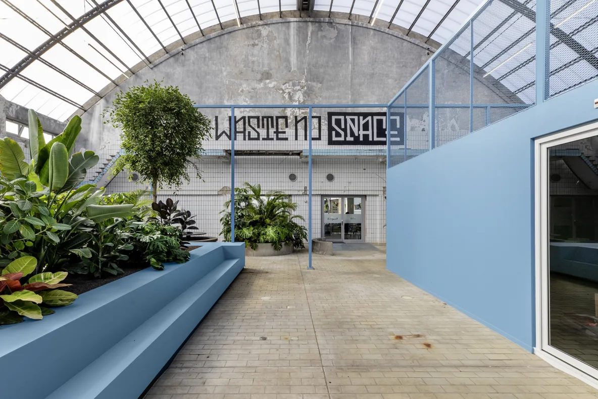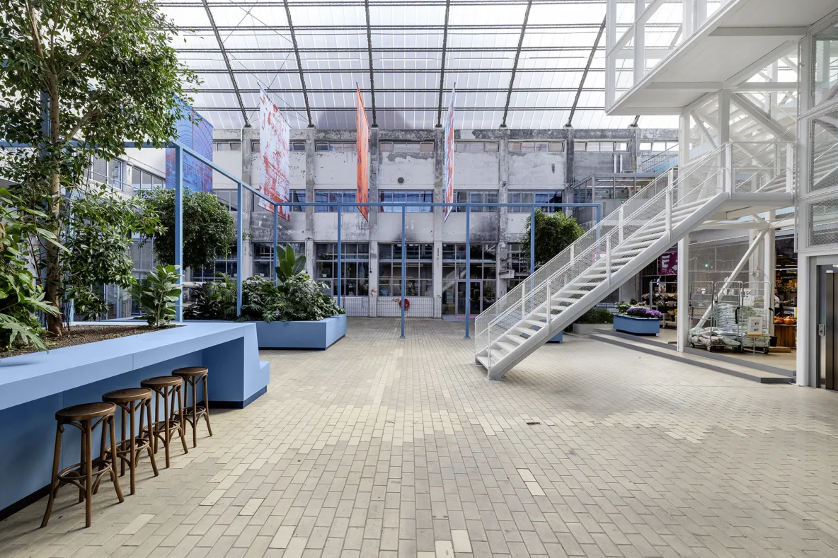 De grote fabriekshal heeft recent een verdere aankleding gekregen met blauwe meubelvolumes. Deze meubels zijn speciaal ontworpen naar de maat en schaal van de hal en sluiten met hun kleur aan bij de originele melkhaltegels die nog aanwezig waren. De uitdaging was om plekken te creëren die geen vaste functie hebben, maar wél uitnodigen tot gebruik. De meubels zijn daarom ontworpen als flexibele zitplekken waar bezoekers hun broodje kunnen eten, studenten kunnen werken of collega’s informeel kunnen overleggen. De hal is daardoor veranderd in een aangename verblijfsplek binnen een verkeersruimte, als een plein in de stad waar mensen vanzelf blijven hangen.