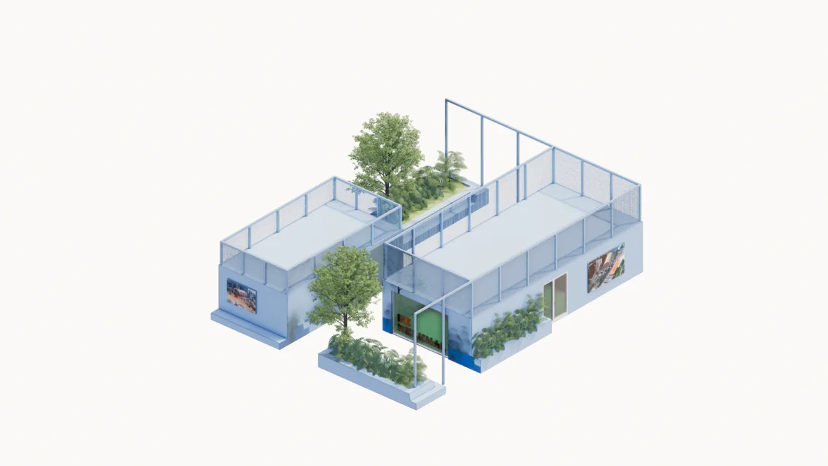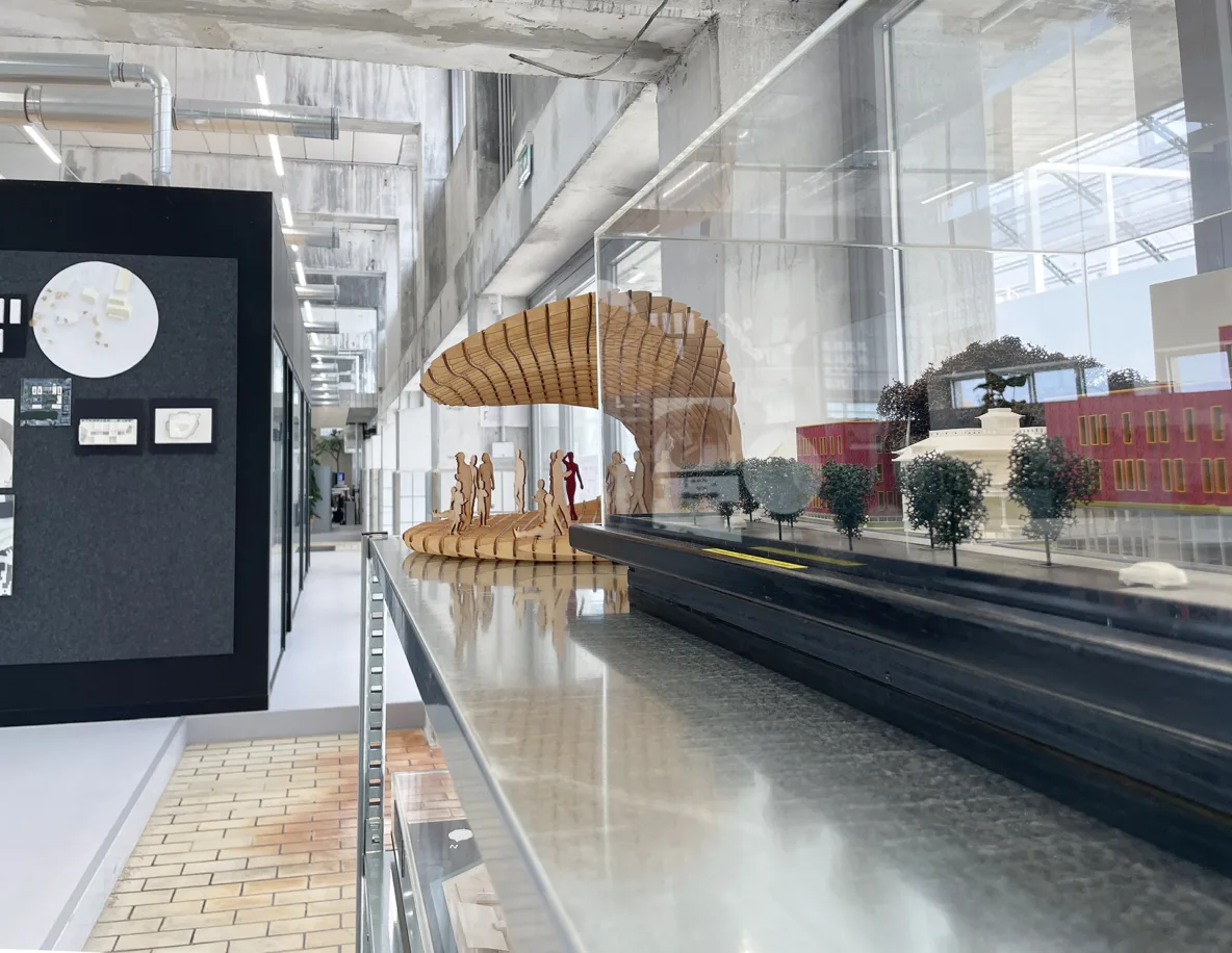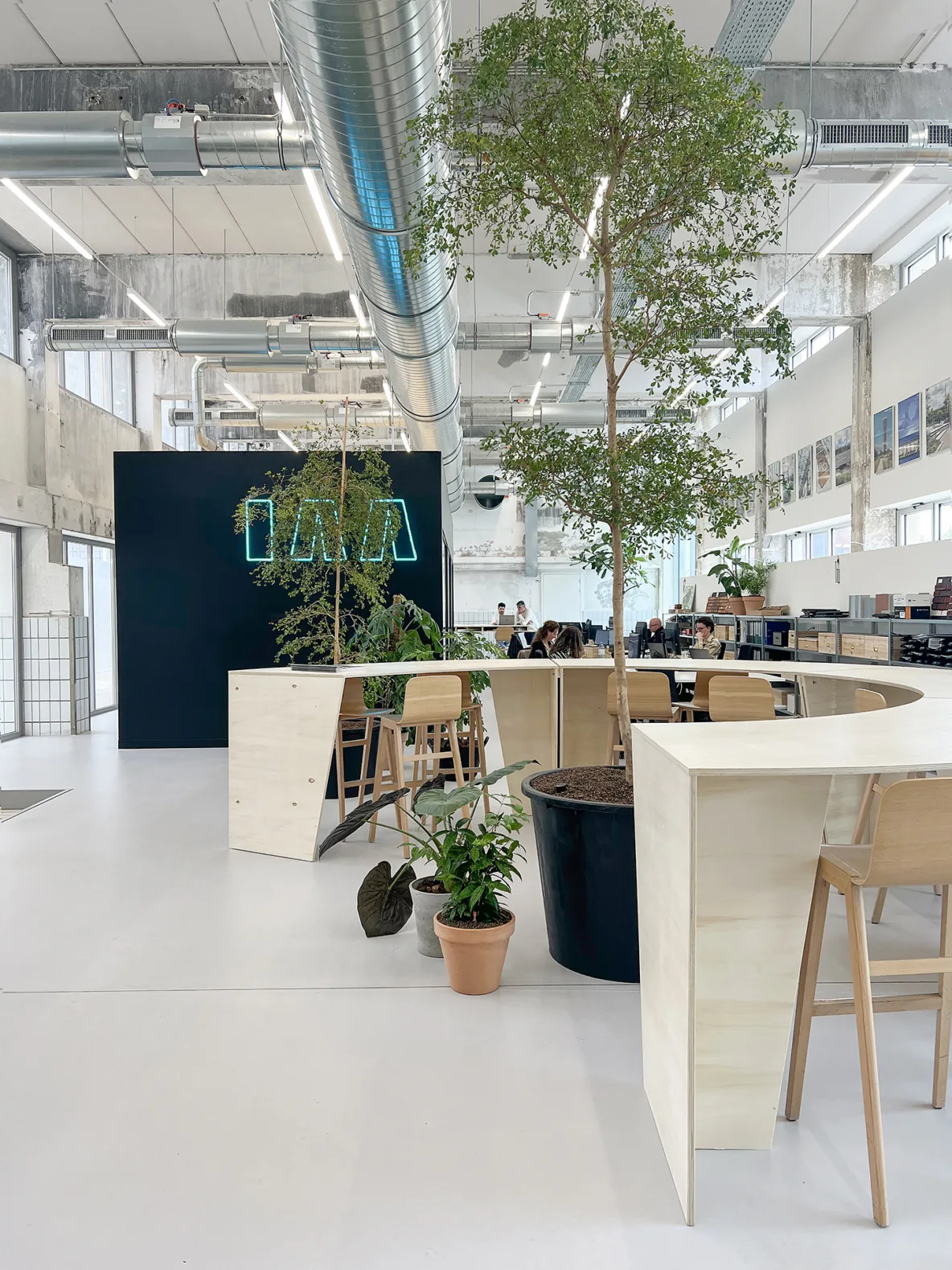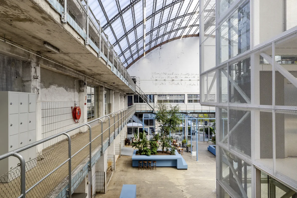 De grote fabriekshal heeft recent een verdere aankleding gekregen met blauwe meubelvolumes. Deze meubels zijn speciaal ontworpen naar de maat en schaal van de hal en sluiten met hun kleur aan bij de originele melkhaltegels die nog aanwezig waren. De uitdaging was om plekken te creëren die geen vaste functie hebben, maar wél uitnodigen tot gebruik. De meubels zijn daarom ontworpen als flexibele zitplekken waar bezoekers hun broodje kunnen eten, studenten kunnen werken of collega’s informeel kunnen overleggen. De hal is daardoor veranderd in een aangename verblijfsplek binnen een verkeersruimte, als een plein in de stad waar mensen vanzelf blijven hangen.