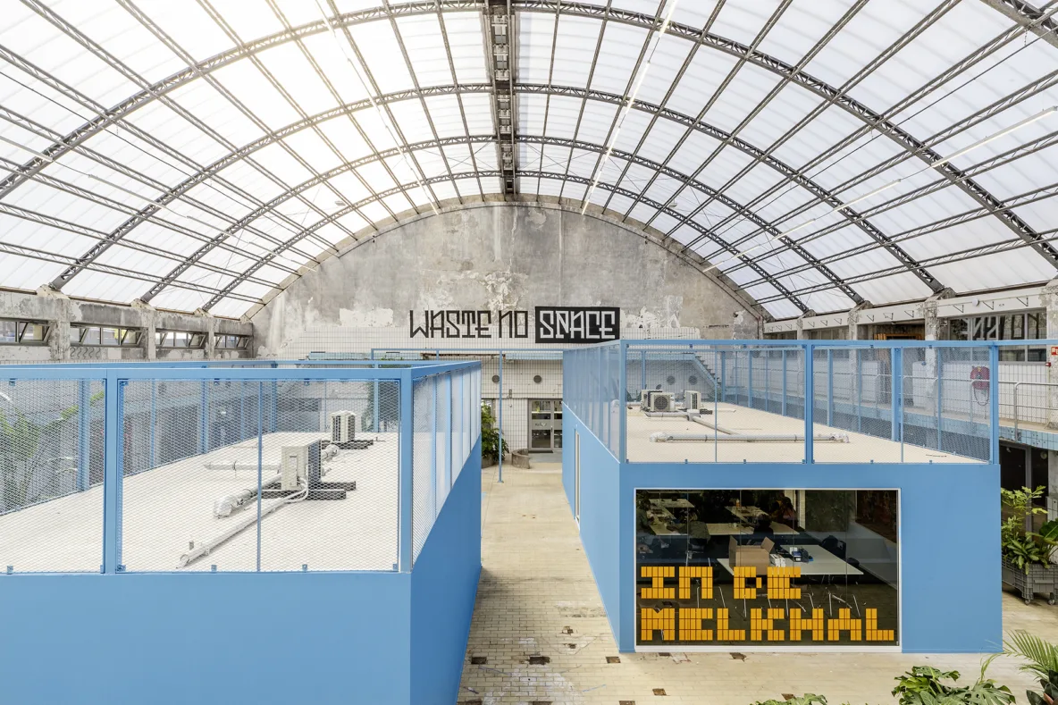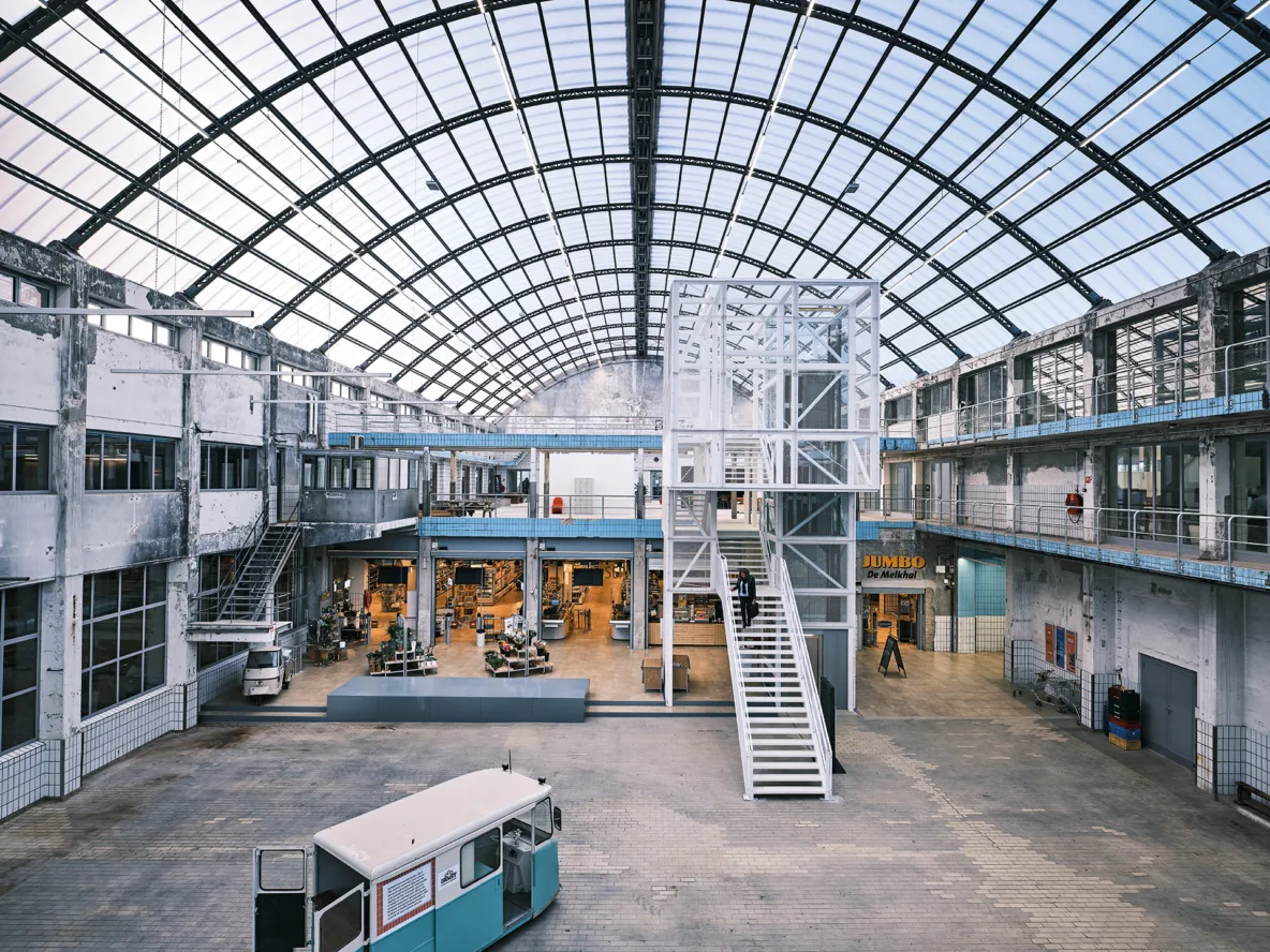 Wie de Melkhal binnenstapt, wordt direct getroffen door de spectaculaire overkapping. Het was nog even spannend of die in ere hersteld kon worden. Jarenlange leegstand en vandalisme hadden hun sporen achtergelaten en zelfs bomen groeiden door het dak. De kap leek aanvankelijk een groot risico in de ontwikkeling, niemand wist of de constructie nog sterk genoeg was. Gelukkig bleek de staalconstructie sterk en kon het dak volledig worden hersteld. De lichtinval die daardoor de ruimte vult, geeft de Melkhal haar karakteristieke sfeer terug.