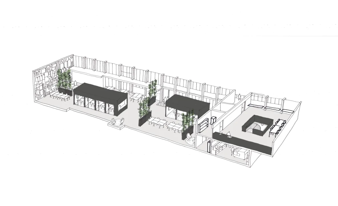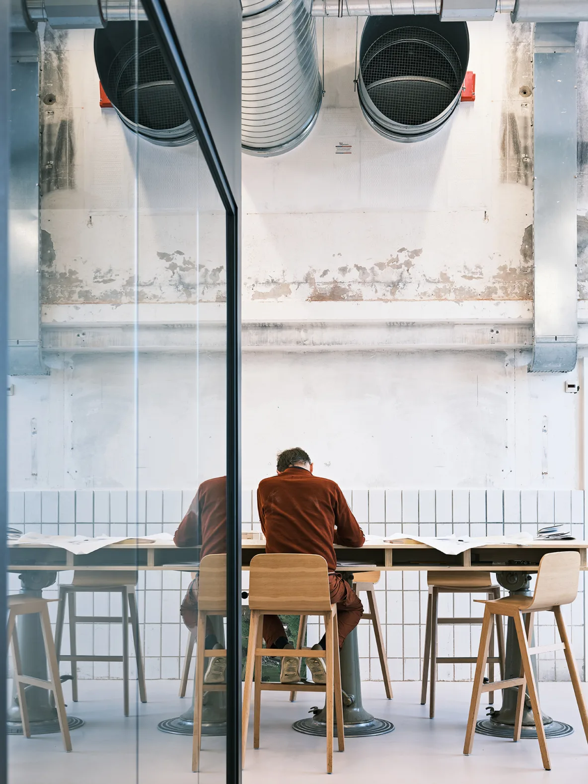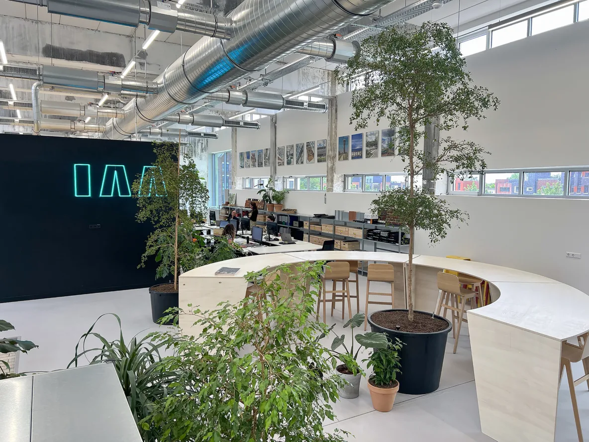 Wij zijn trots op dit project. Zo trots dat we besloten om hier zelf ons bureau te vestigen. Onze werkruimte bevindt zich op de eerste verdieping langs de volledige noordgevel en heeft een oppervlakte van ongeveer 750 vierkante meter. De ruimte is zes meter hoog en badend in daglicht. Twee transparante vergaderkamers verdelen de ruimte op natuurlijke wijze in kleinere werkclusters, zonder het open karakter te verliezen. In het entreegebied ontvangen we bezoekers aan een grote, ronde tafel die fungeert als hart van de werkvloer. Hier ontmoeten collega’s, partners en opdrachtgevers elkaar.
