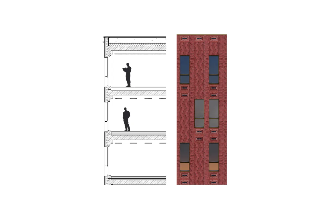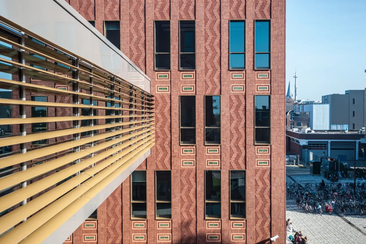 Op de hoek van het gebouw opent een verdiepinghoog venster zich naar de stad. Hierin liggen de laboratoria van Living Technology – de innovatieve leeromgeving van Saxion waar onderwijs en toegepast onderzoek samenkomen. Voorbijgangers kunnen letterlijk naar binnen kijken en zien wat er binnen gebeurt. De transparantie symboliseert de open houding van de hogeschool: kennis is niet afgesloten binnen muren, maar zichtbaar en deel van de stad.