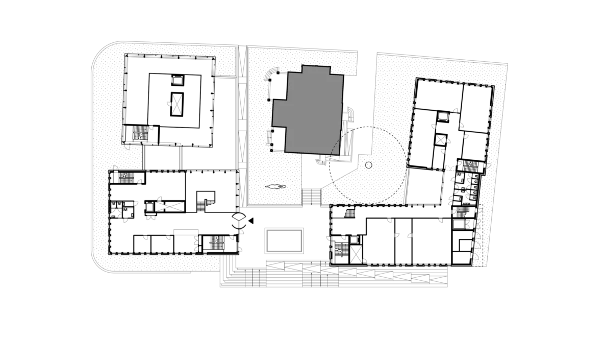 Het nieuwe complex bestaat uit vier zelfstandige bouwdelen die op maaiveldniveau volledig flexibel indeelbaar zijn. Samen vormen zij een herkenbaar ensemble dat zich voegt naar de schaal en korrel van de omliggende bebouwing. Een verhoogd souterrain verbindt de volumes onderling en laat daglicht diep het gebouw binnendringen. Op hoger niveau zorgen luchtbruggen voor een vloeiende relatie tussen de onderdelen en met de aangrenzende villa.