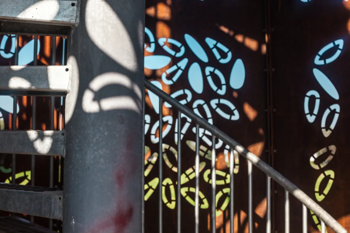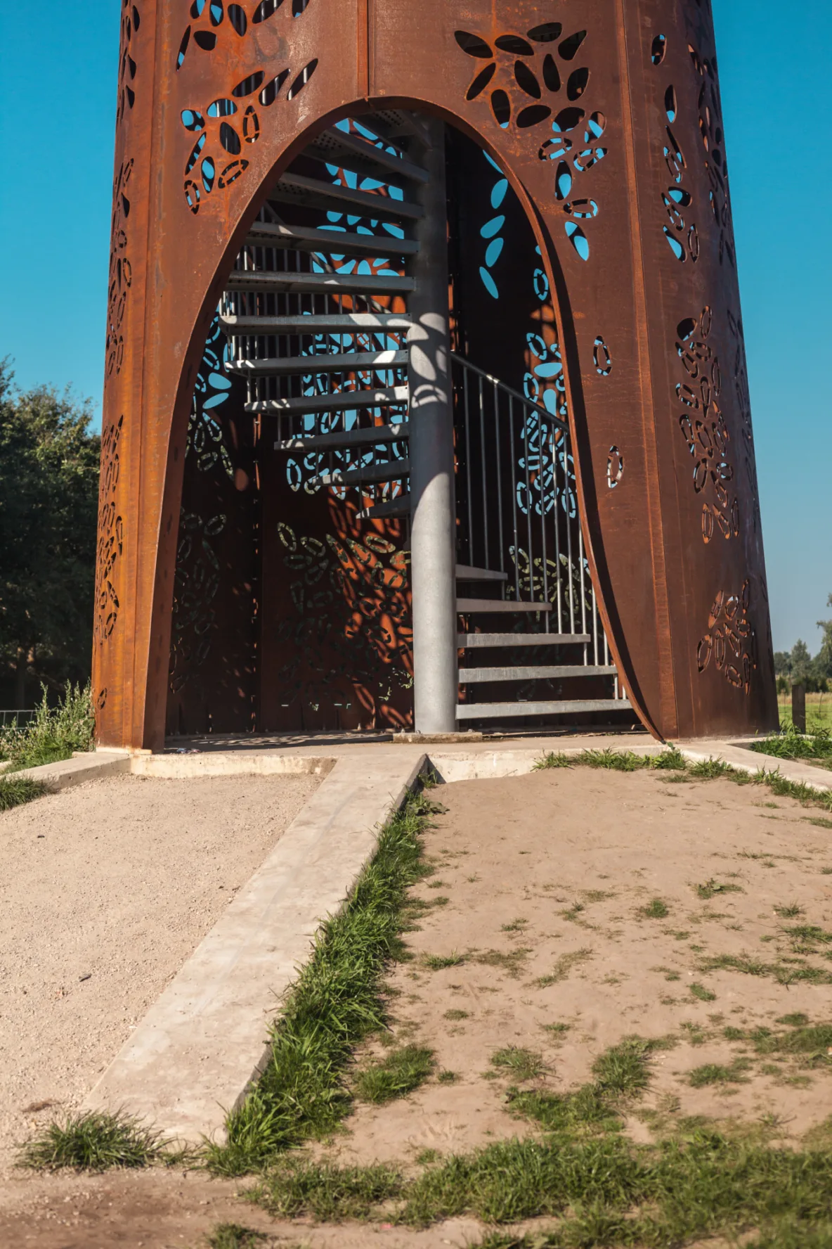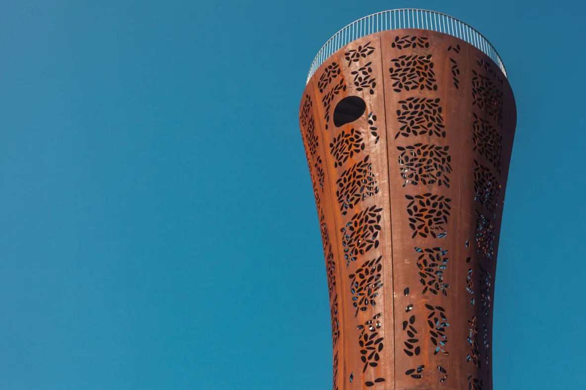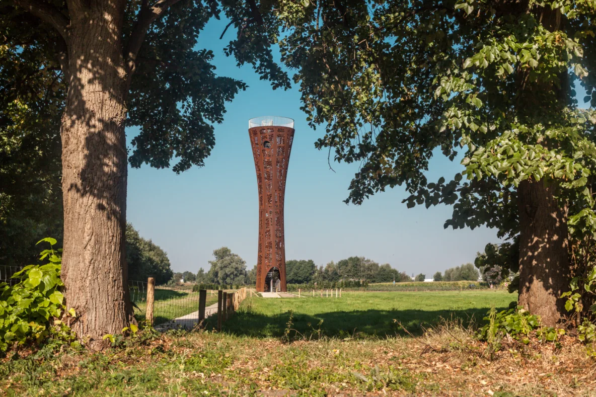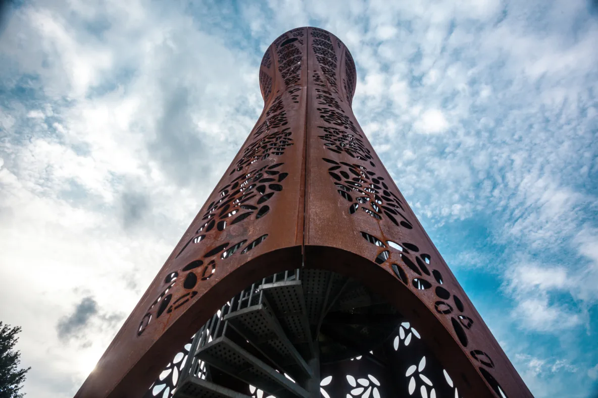 De keuze voor cortenstaal is zowel praktisch als symbolisch. Het materiaal verwijst naar het industriële erfgoed van Hengelo en vormt een eerbetoon aan de metaalindustrie die de stad heeft gevormd. De warme roestbruine kleur verandert met het weer en de seizoenen, waardoor de toren steeds een ander karakter krijgt. Tegelijkertijd is het materiaal onderhoudsvrij en gaat het lang mee. Zo wordt de toren een duurzaam baken dat op natuurlijke wijze opgaat in zijn omgeving.