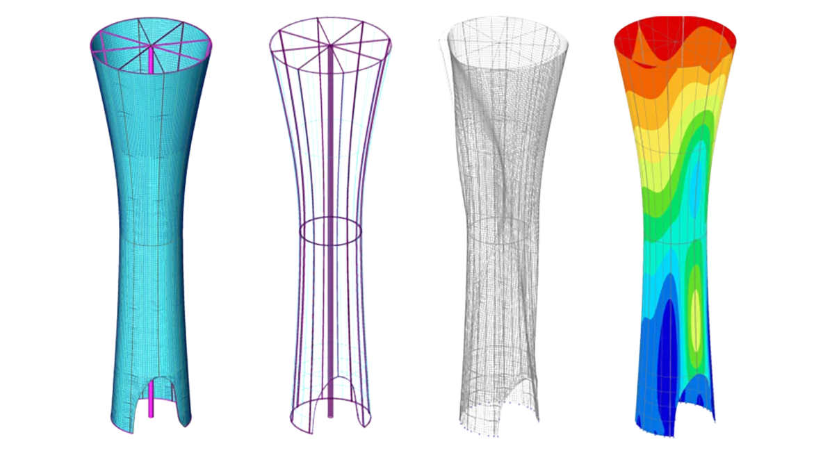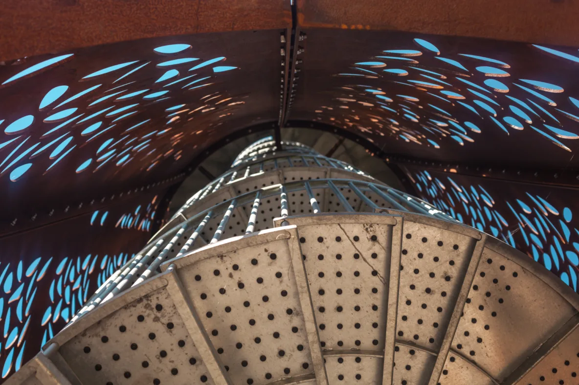 Het ontwerp begon met een uitdagende vraag: hoe maak je een markant en duurzaam bouwwerk in een gebied waar geen diepe fundering is toegestaan? Ons antwoord was een lichte, zelfdragende constructie die stabiliteit haalt uit precisie en eenvoud. De toren bestaat uit een kelkvormige koker van cortenstaal waarin een spiltrap met bordessen omhoog slingert.