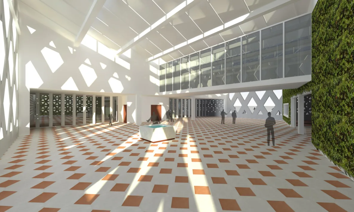 De identiteit van de moskee is sterk verbonden met de geschiedenis van Enschede. De eerste Turkse gastarbeiders vonden hier werk in de textielfabrieken, en dat erfgoed is subtiel verwerkt in het gevelontwerp. De patronen in het beton verwijzen naar de weefpatronen uit de Twentse textielindustrie, maar ook naar de rijke geometrische ornamentiek van de islamitische architectuur. Zo ontstaat een gevel die het verhaal van beide werelden vertelt. De mate van openheid varieert per functie: ingetogen bij de gebedsruimte, uitnodigend bij de avlu.
