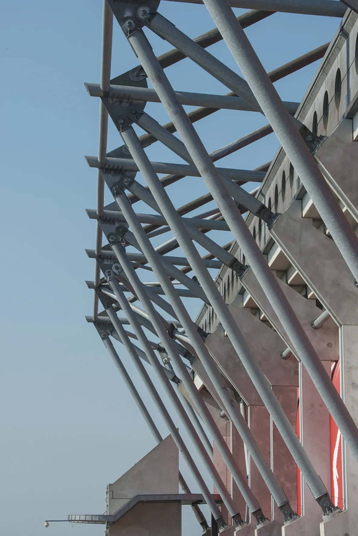 In 2007 volgde de eerste uitbreiding. We ontwierpen een tweede ring aan de zuid- en westzijde, die niet alleen meer plek bood voor ruim 10.000 toeschouwers, maar ook het karakter versterkte. In diezelfde periode werd het stadion herdoopt tot De Grolsch Veste: een naam die net zo verankerd is in Twente als de club zelf.
