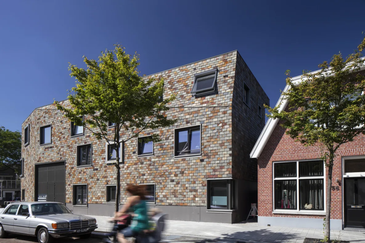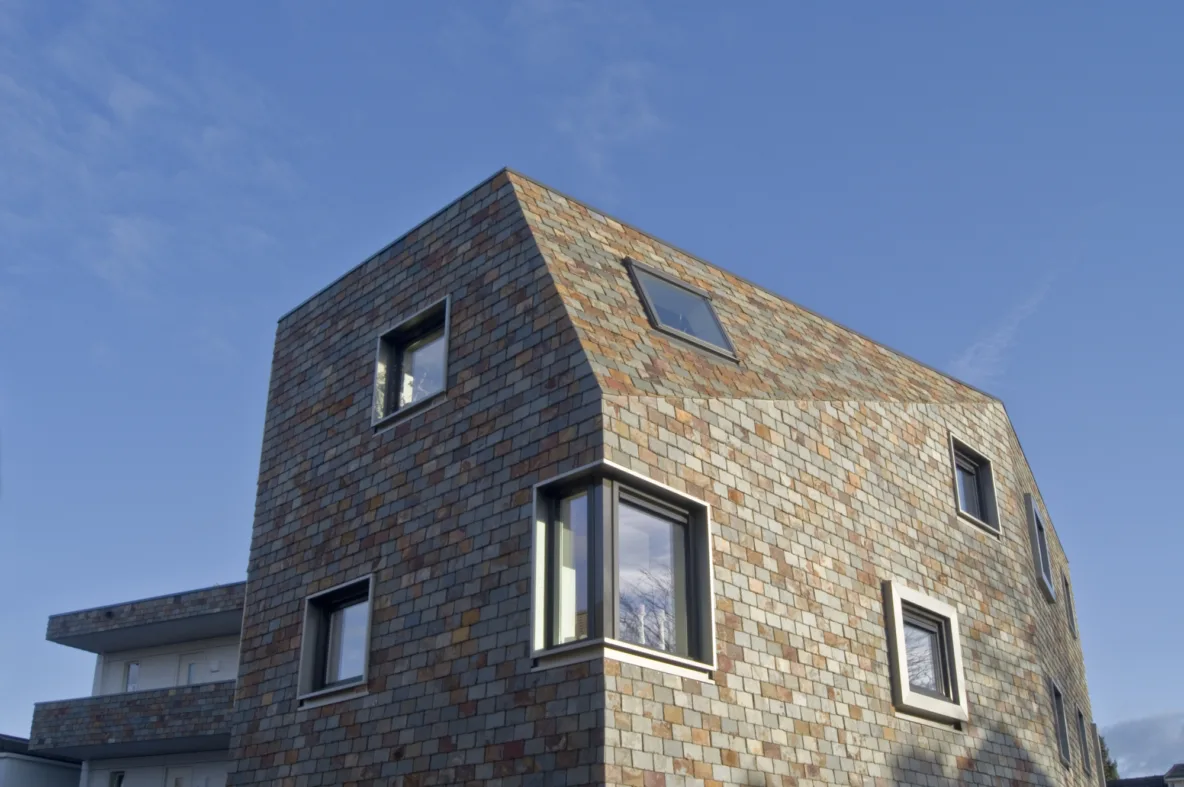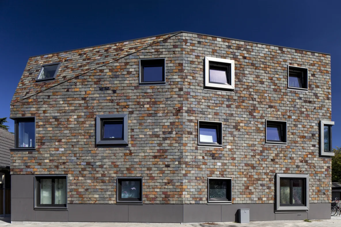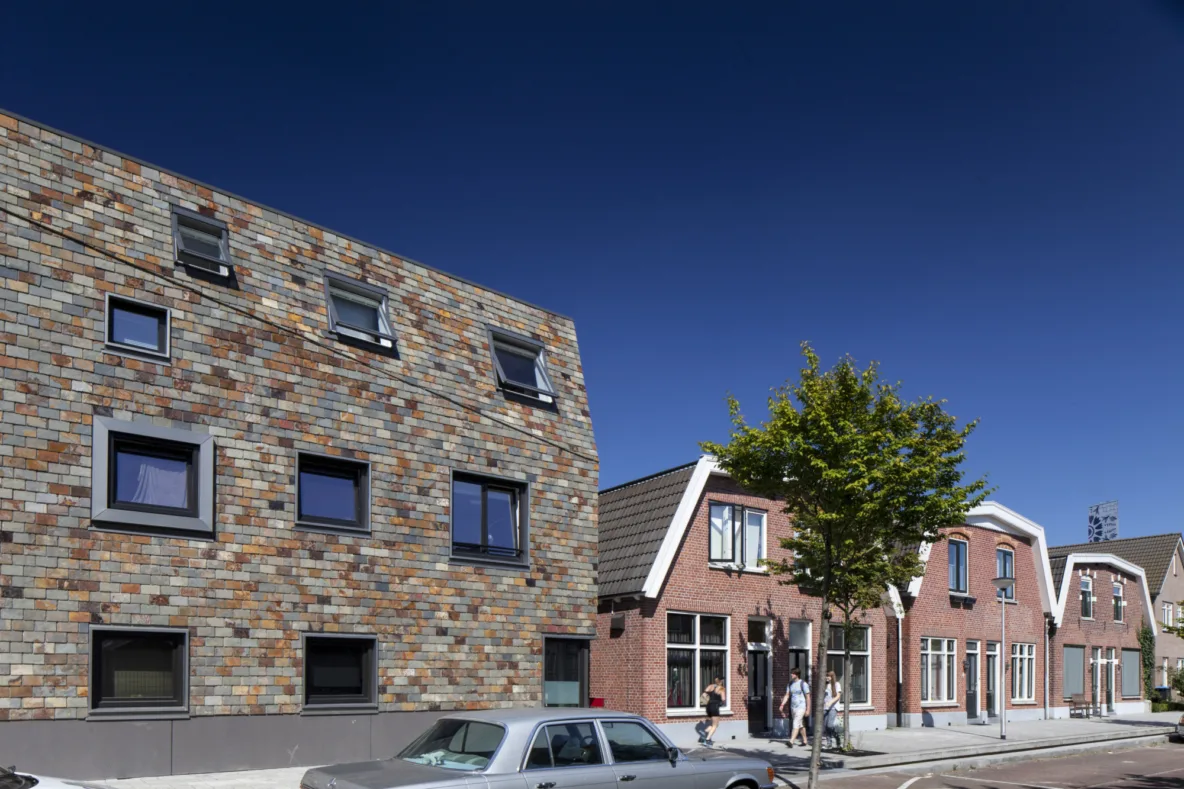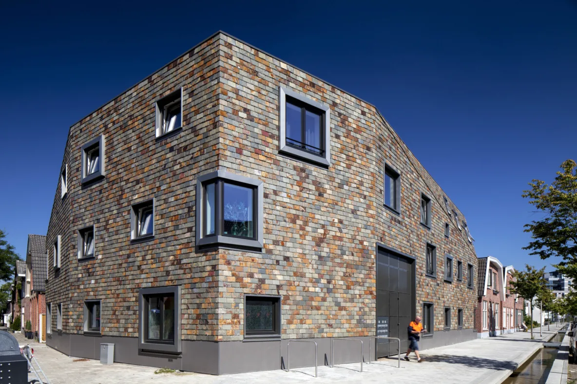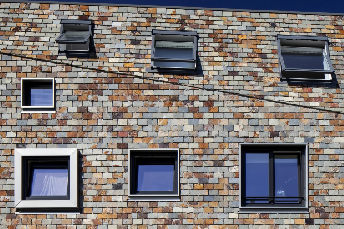 Elk appartement heeft zijn eigen identiteit. De ramen zijn steeds anders gepositioneerd, zorgvuldig afgestemd op bezonning, uitzicht en privacy. Deze variatie geeft de gevels levendigheid en maakt ieder appartement uniek. De gevelbekleding van veelkleurig leisteen versterkt dat effect: het materiaal vangt het licht steeds anders, waardoor het gebouw subtiel van karakter verandert gedurende de dag.
