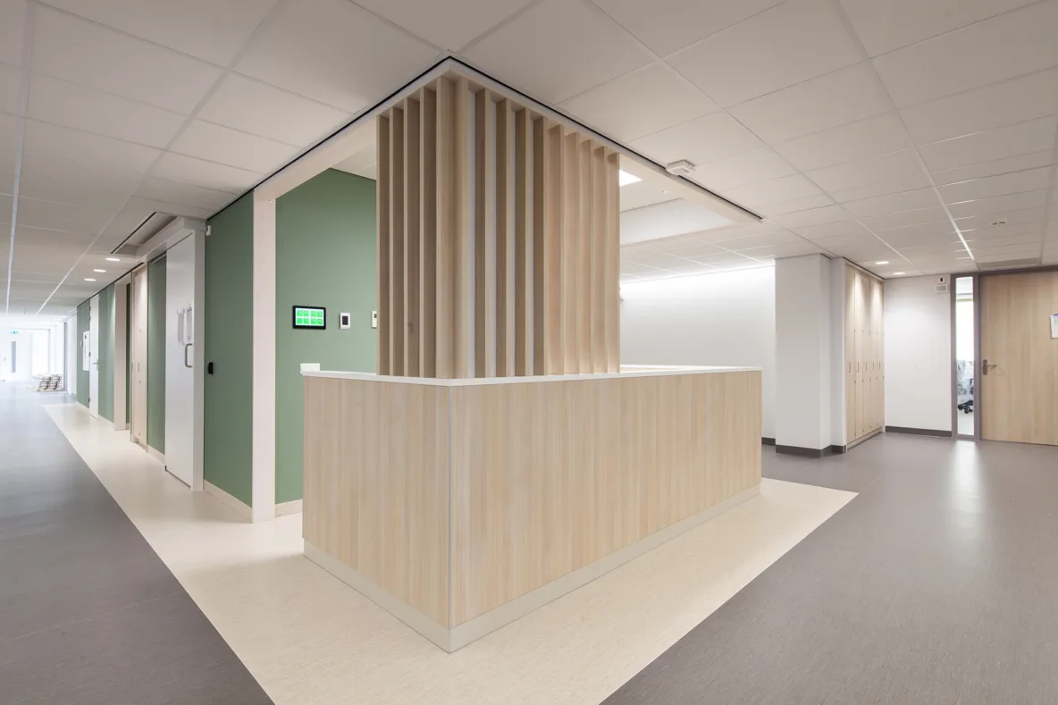 Bouwdeel Zuid vormt het startpunt van die schuifbewegingen. Het is de grootste nieuwbouwopgave binnen het Masterplan: een compact en efficiënt gebouw van vier verdiepingen, waarin verpleegafdelingen, de nieuwe IC en CCU, en een vergrote ambulancehal direct naast de SEH samenkomen. Belangrijk was het creëren van optimale verbindingen tussen oud en nieuw. Via logische routes en overzichtelijke aansluitingen blijft het ziekenhuis voor patiënten, bezoekers en medewerkers herkenbaar en leesbaar.