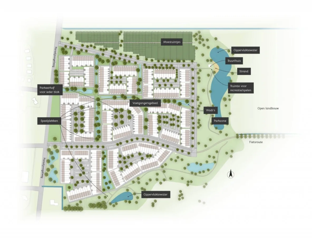 De woningen zijn voorzien van zonnepanelen en luchtwarmtepompen, wat ze het energielabel A+++ geeft. De wijk combineert milieuvriendelijk wonen met een groen ontwerp. Wadi’s zorgen voor natuurlijke waterafvoer, en er komt een strand langs de kreek die door het gebied loopt. Naarmate de wijk verder uitbreidt richting het westen, zullen de houten gevels geleidelijk overgaan in baksteen, wat een vloeiende overgang in het straatbeeld biedt.