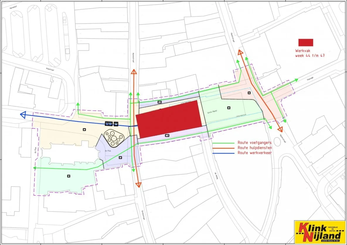 Sinds 31 oktober is infra-aannemer Klink-Nijland aan de slag om het centrum van Raalte te vernieuwen volgens het inrichtingsplan van IAA Architecten. De aannemer is gestart op de Grote Markt met ondergrondse werkzaamheden om vervolgens een nieuw infiltratiesysteem aan te leggen dat het regenwater in zogenaamde kratten kan opvangen. Na afloop wordt er een tijdelijke noodbestrating aangelegd; de winkels en woningen in het centrum blijven gewoon bereikbaar.