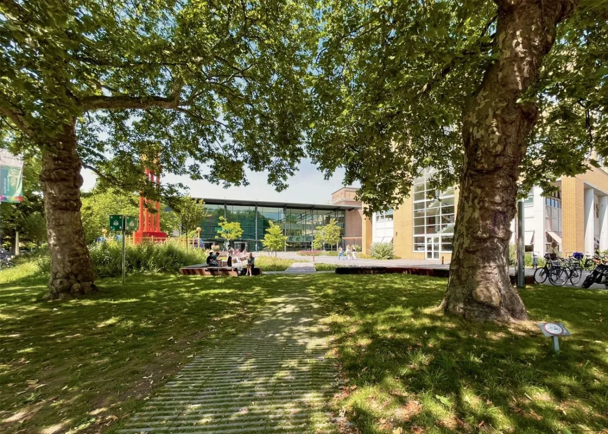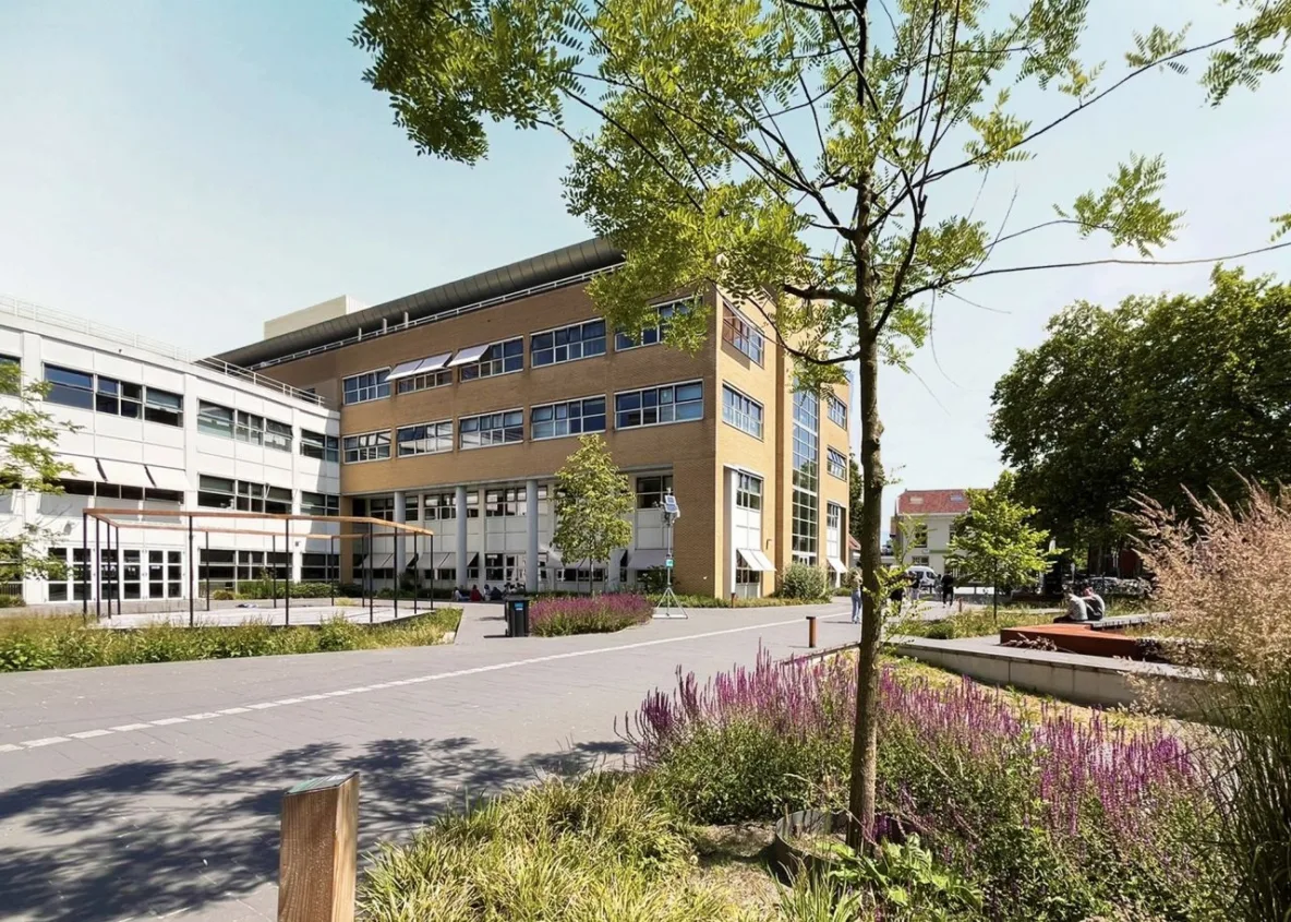 Het voorplein van Hogeschool Saxion in Enschede is in 2023 volledig vernieuwd. Geen stenen plein meer, maar een klimaat adaptief plein vol beplanting, raingardens en leven.
