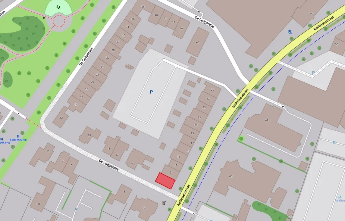 De woning op de zuidelijke hoek van de Raiffeisenstraat en De Coöperatie sluit een rij met stadswoningen af. Voor deze woningen golden strenge beeldkwaliteitseisen om gezamenlijk een verwijzing te vormen naar een lange, gele, bakstenen gevel van de zuivelfabriek die hier vroeger stond. De hoekwoning wijkt door haar uitzonderingspositie daar enigszins vanaf door het opgetilde vloerniveau, de plastische zijgevel en de introductie van wit stucwerk naast het voorgeschreven gele metselwerk. Juist door de plastiek en de witte accenten vormt de woning een schakel tussen de stadswoningen langs de Raiffeisenstraat en de vrije vormgeving van de woningen aan De Coöperatie. De daadwerkelijke oplevering is gepland in maart 2023.