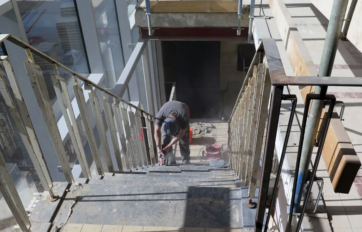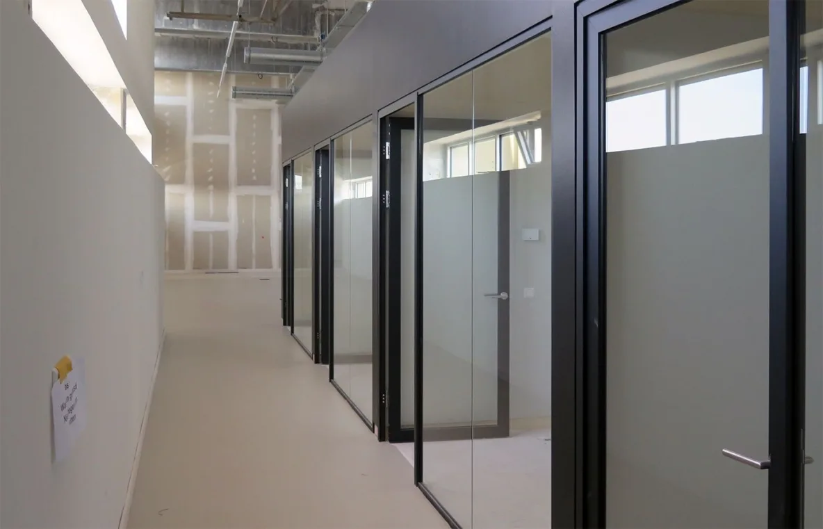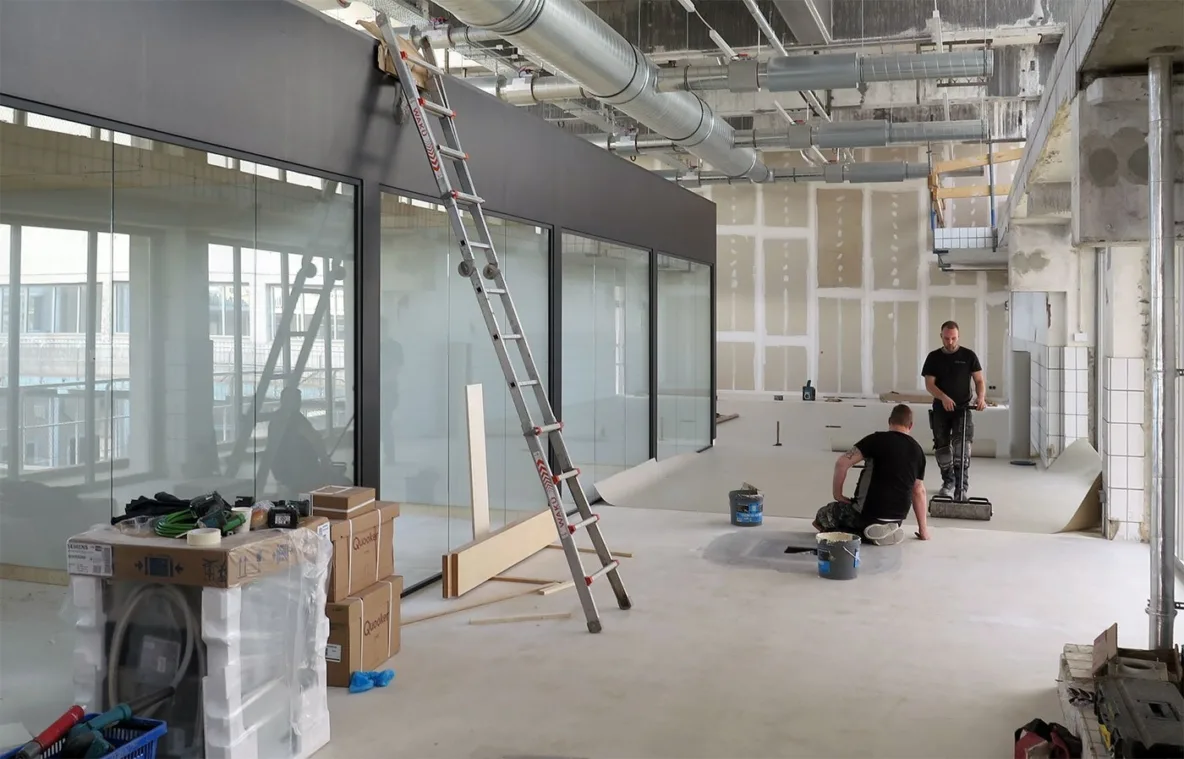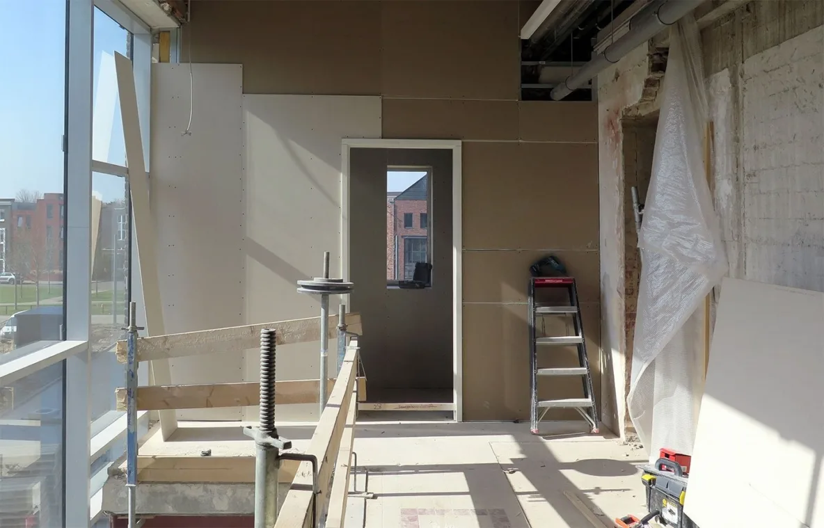 Intussen zijn de interieurbouwers de ruimten van IAA Architecten aan het voltooien en zijn de toiletten bijna af aan de kant van de entree met de grote glazen pui. De personenlift in de hal is inmiddels geplaatst en heeft twee stopplaatsen: op de 1e en 2e verdieping zodat iedereen het kantoor van IAA Architecten drempelloos kan bereiken.