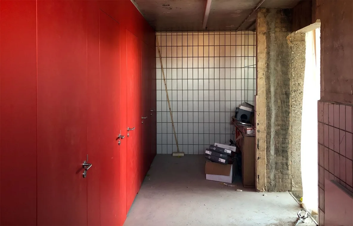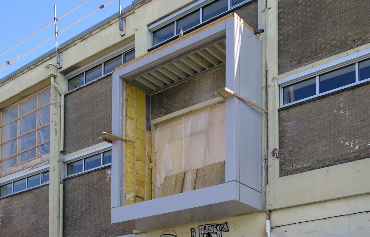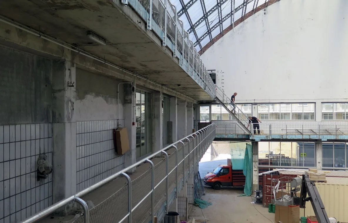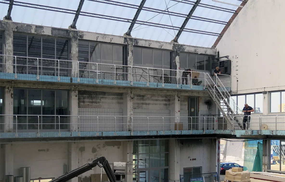 Het rauwe karakter van de voormalige fabriek blijft bewaard, dat is een bewuste keuze, maar noodzakelijke elementen worden hersteld met een zorgvuldige detaillering die het complex respecteert. Een voorbeeld is het gaas aan de balkonhekwerken: nauwelijks zichtbaar maar uiterst functioneel als doorval-beveiliging.