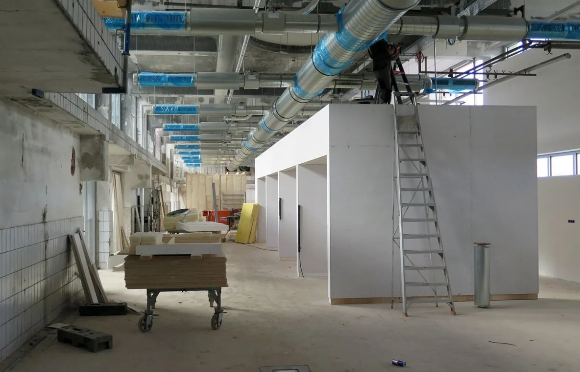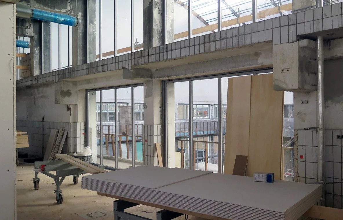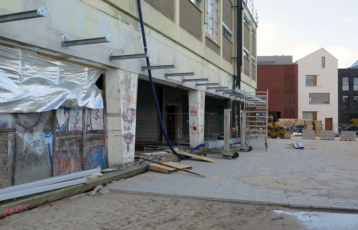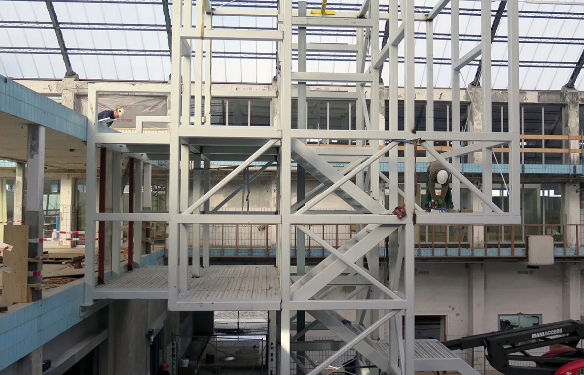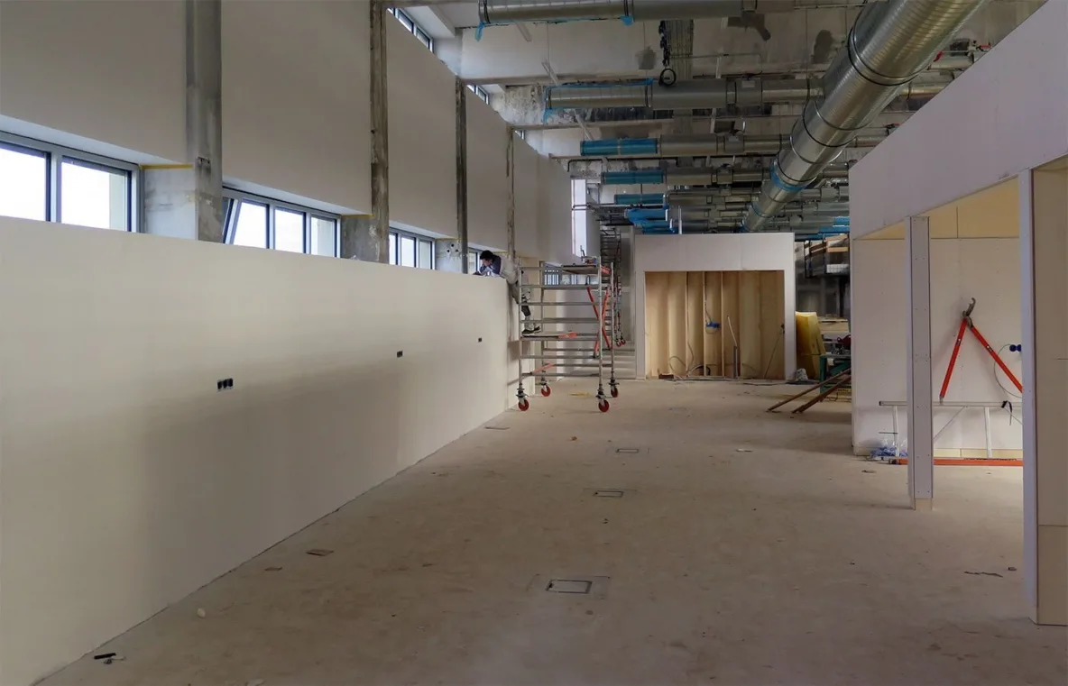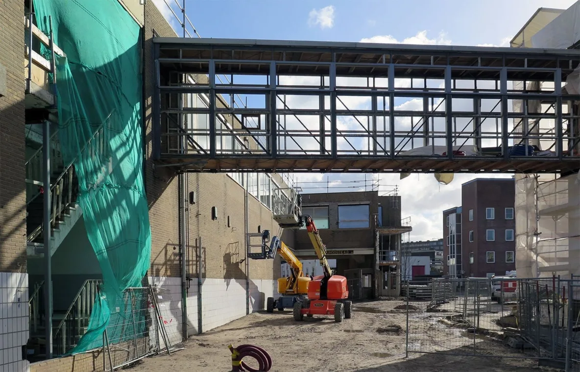 Afgelopen donderdag was goed te zien dat de staalbouwers de montage van de constructie voor de lift en de trap voor elkaar hadden. Het vervolg was het vastlassen van de verbindingen en het leggen van de vloertjes in de bordessen. Ook begint de nieuwe kantoorruimte van IAA Architecten zijn eindvorm te naderen: de casco’s van de vergaderruimtes staan en het is opvallend hoeveel daglicht het kantoor krijgt, zowel van buiten als vanuit de hal. Het wordt er prachtig! In de kopgevel van de Melkhal zijn verdiepinghoge kozijnen geplaatst die voor een transparante scheiding zorgen tussen binnen en buiten. En aan de kant van de parkeerplaats is de ophanging van de luifel al te herkennen waar de ingang van de supermarkt komt. Hieronder een serie foto’s.