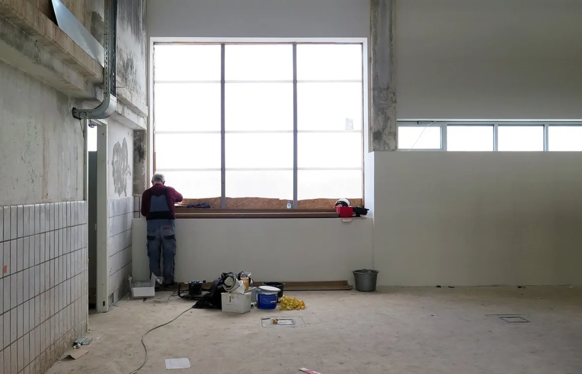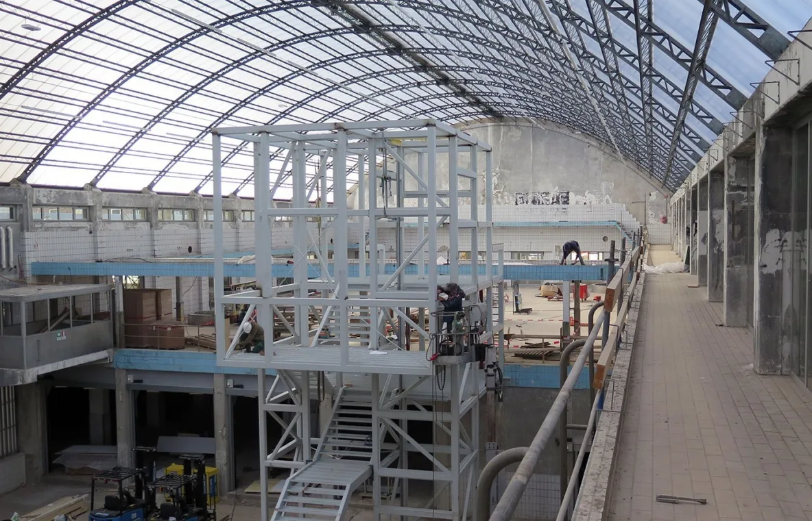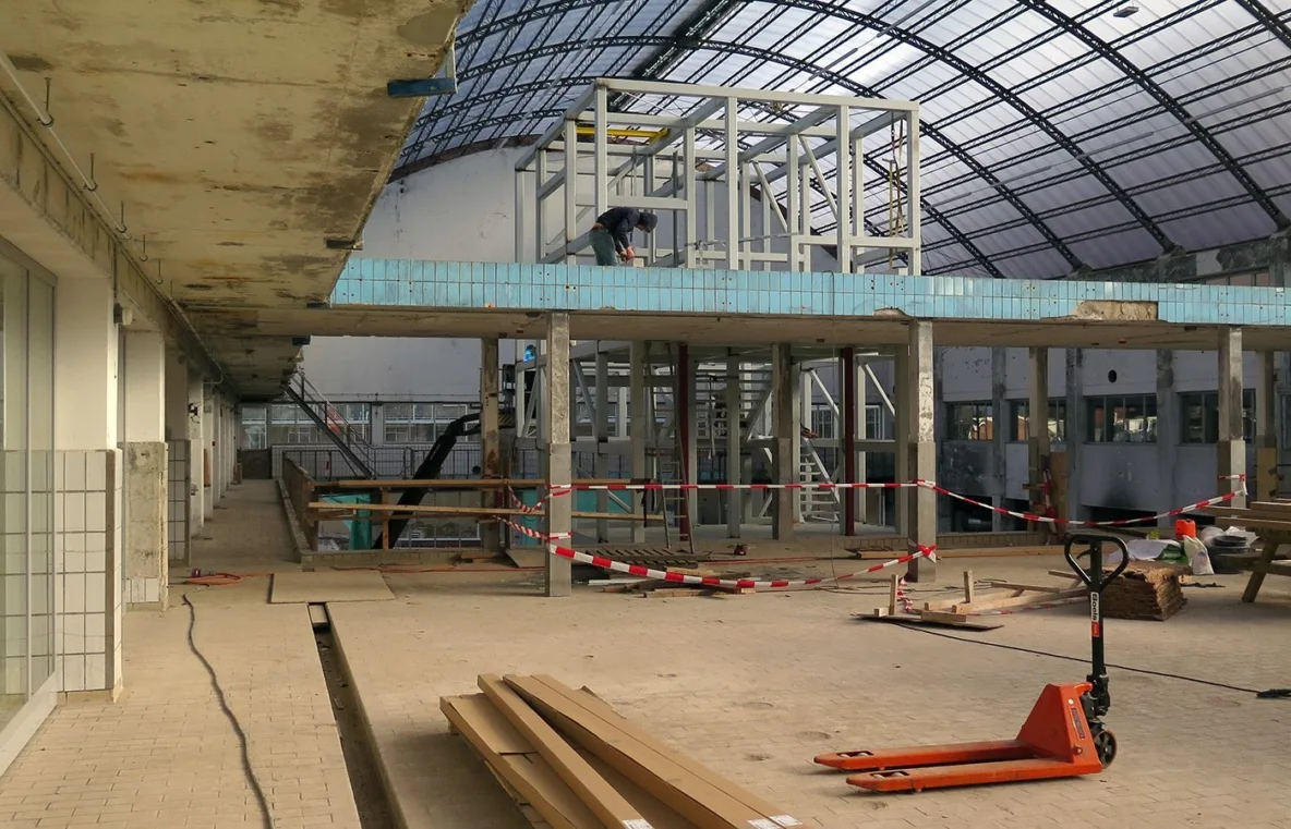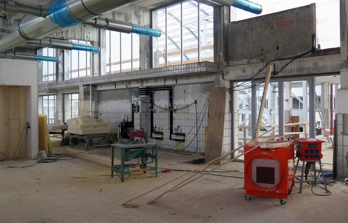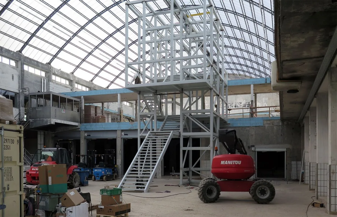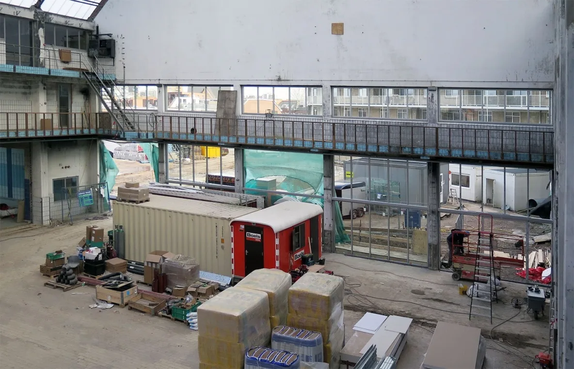 Afgelopen donderdag was goed te zien dat de staalbouwers de montage van de constructie voor de lift en de trap voor elkaar hadden. Het vervolg was het vastlassen van de verbindingen en het leggen van de vloertjes in de bordessen. Ook begint de nieuwe kantoorruimte van IAA Architecten zijn eindvorm te naderen: de casco’s van de vergaderruimtes staan en het is opvallend hoeveel daglicht het kantoor krijgt, zowel van buiten als vanuit de hal. Het wordt er prachtig! In de kopgevel van de Melkhal zijn verdiepinghoge kozijnen geplaatst die voor een transparante scheiding zorgen tussen binnen en buiten. En aan de kant van de parkeerplaats is de ophanging van de luifel al te herkennen waar de ingang van de supermarkt komt. Hieronder een serie foto’s.